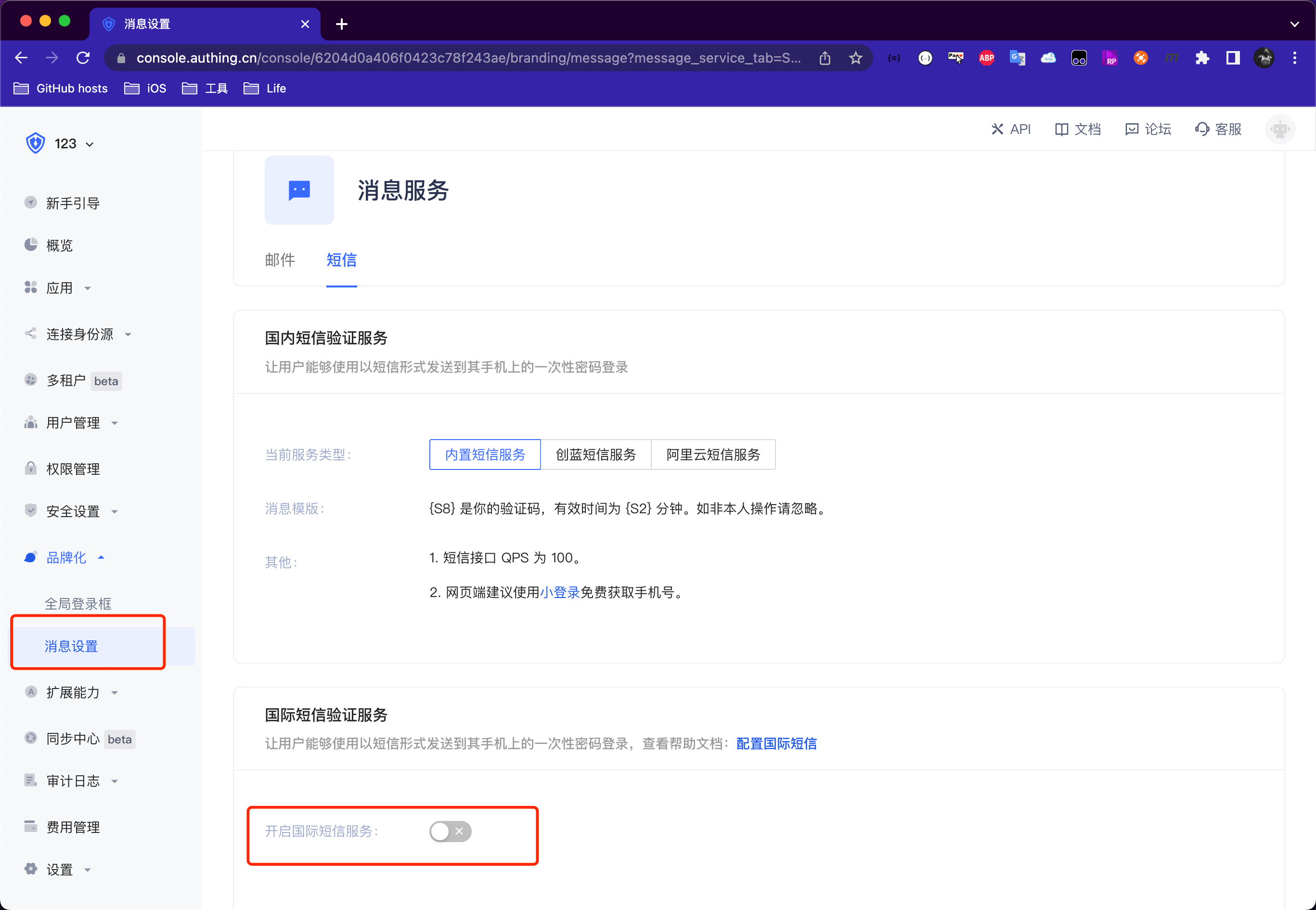 国际化短信服务可以根据控制台设置。比如我们在控制台做如下修改:
