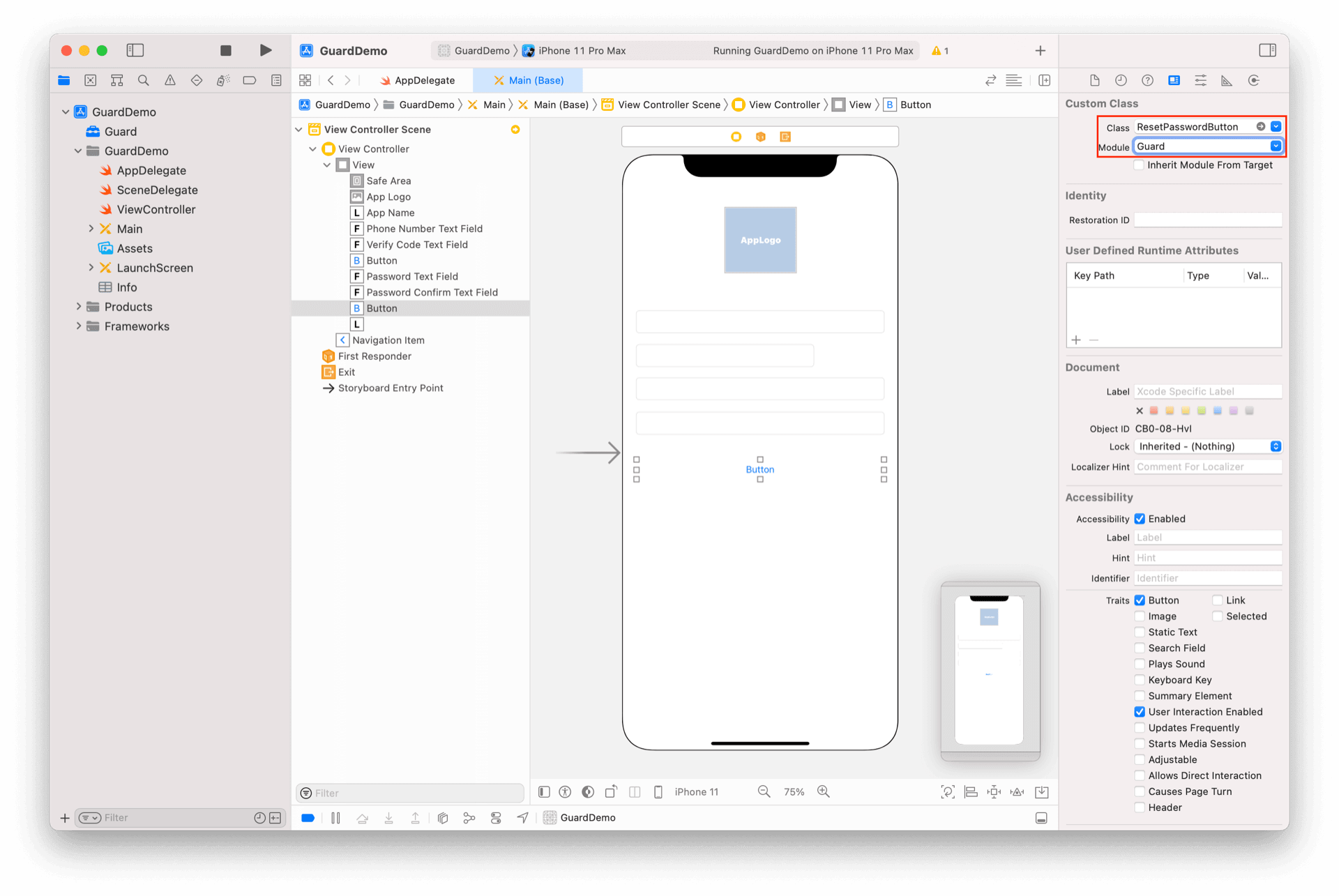 放置一个 Button,将其类型改为 ResetPasswordButton