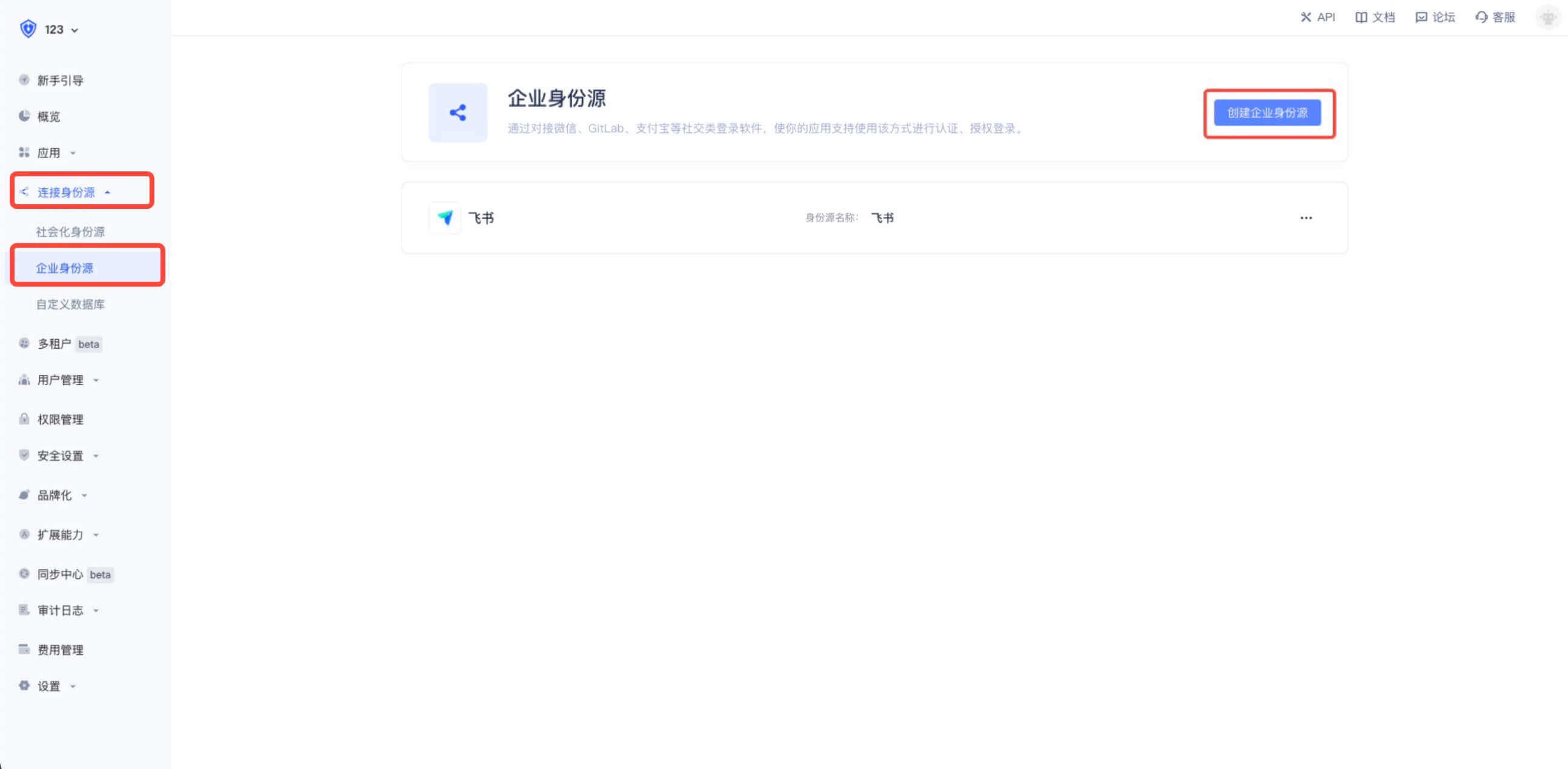 在控制台的 “连接身份源” 菜单选择 “创建企业身份源“