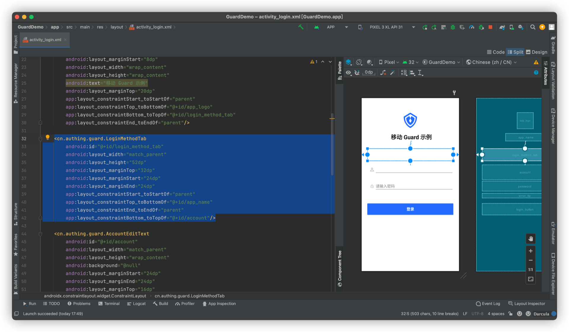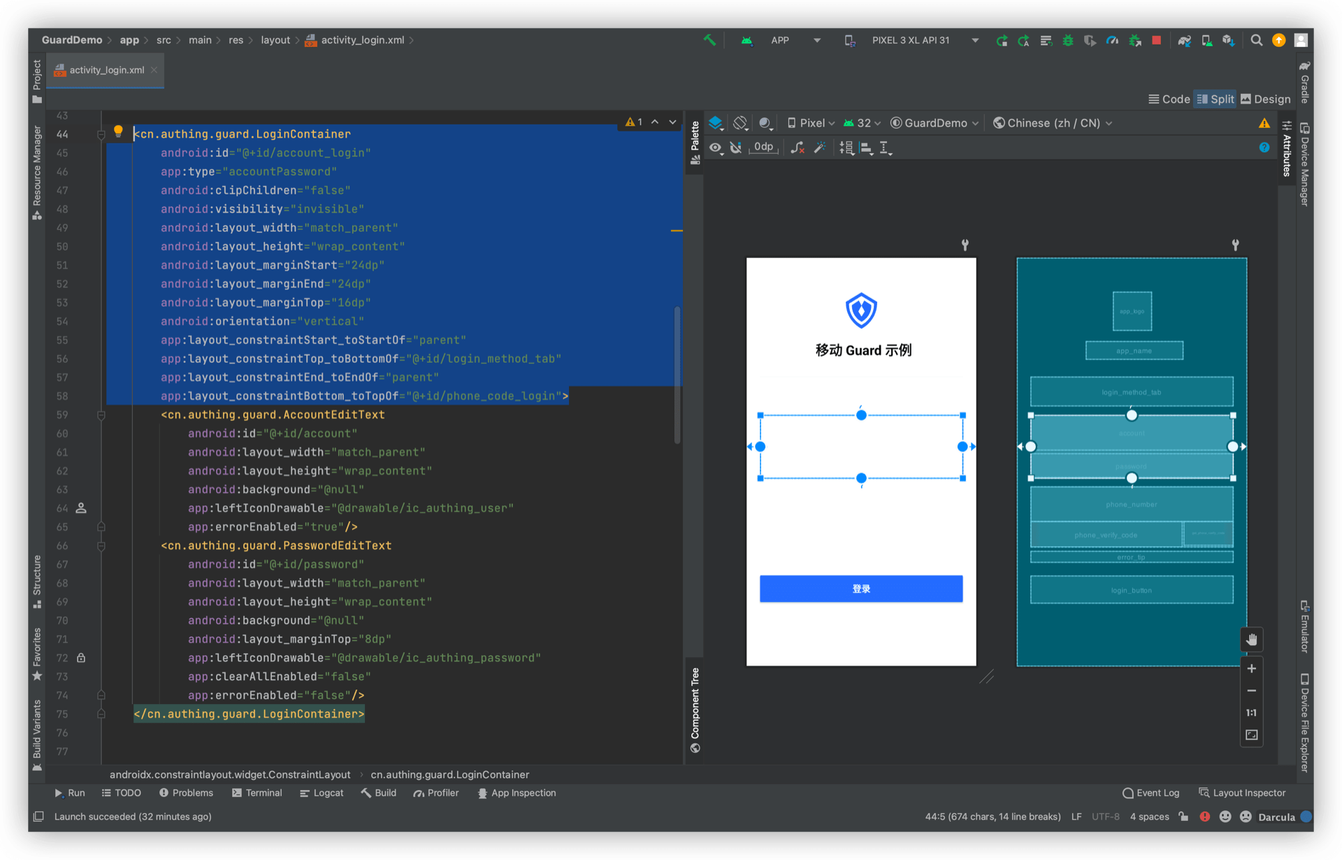 放置一个 LoginContainer,将 AccountEditText 和 PasswordEditText 放到第一个 LoginContainer 里,设置 type 属性app:type="accountPassword"。
