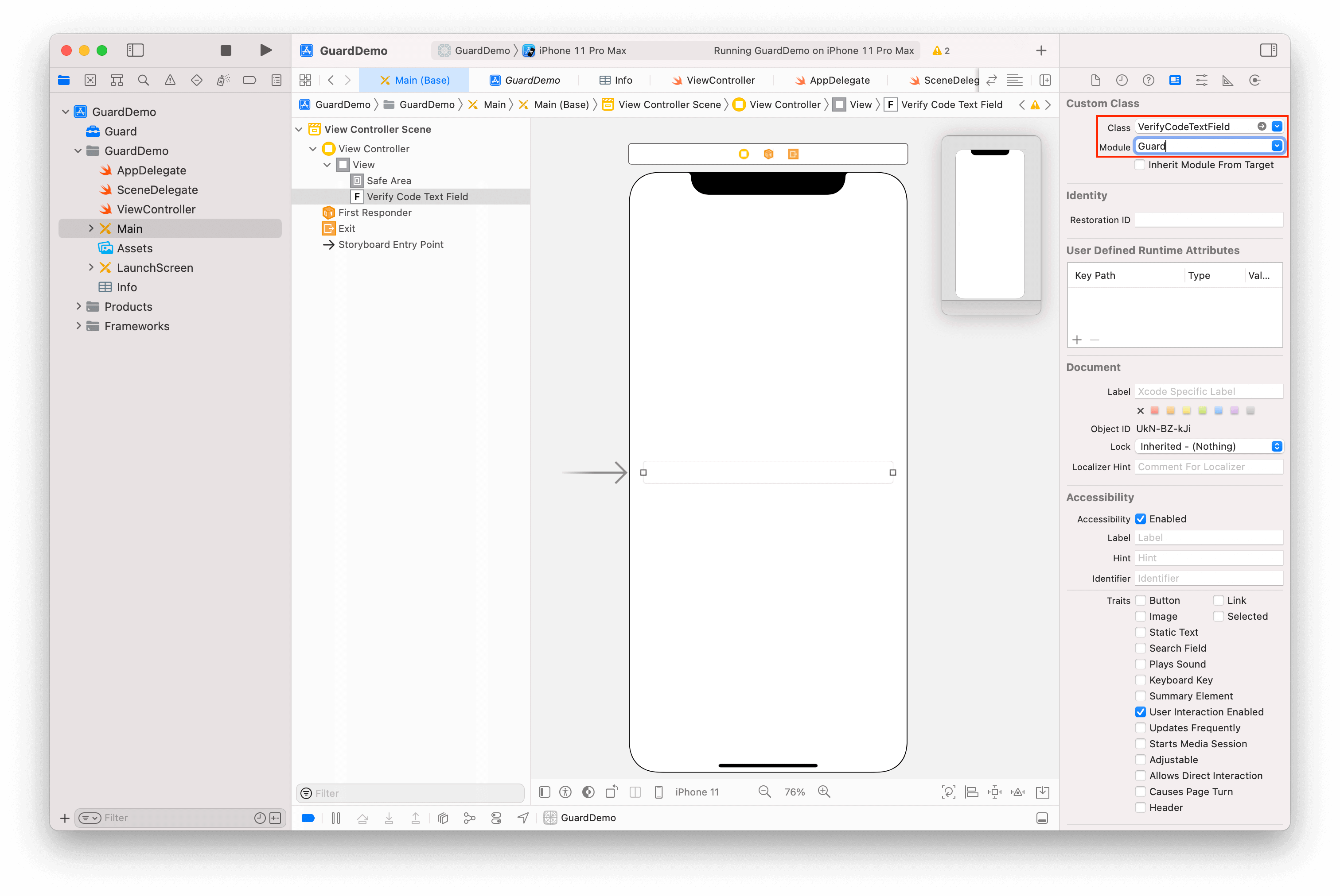 放置一个 TextField,并将其类型改为 VerifyCodeTextField
