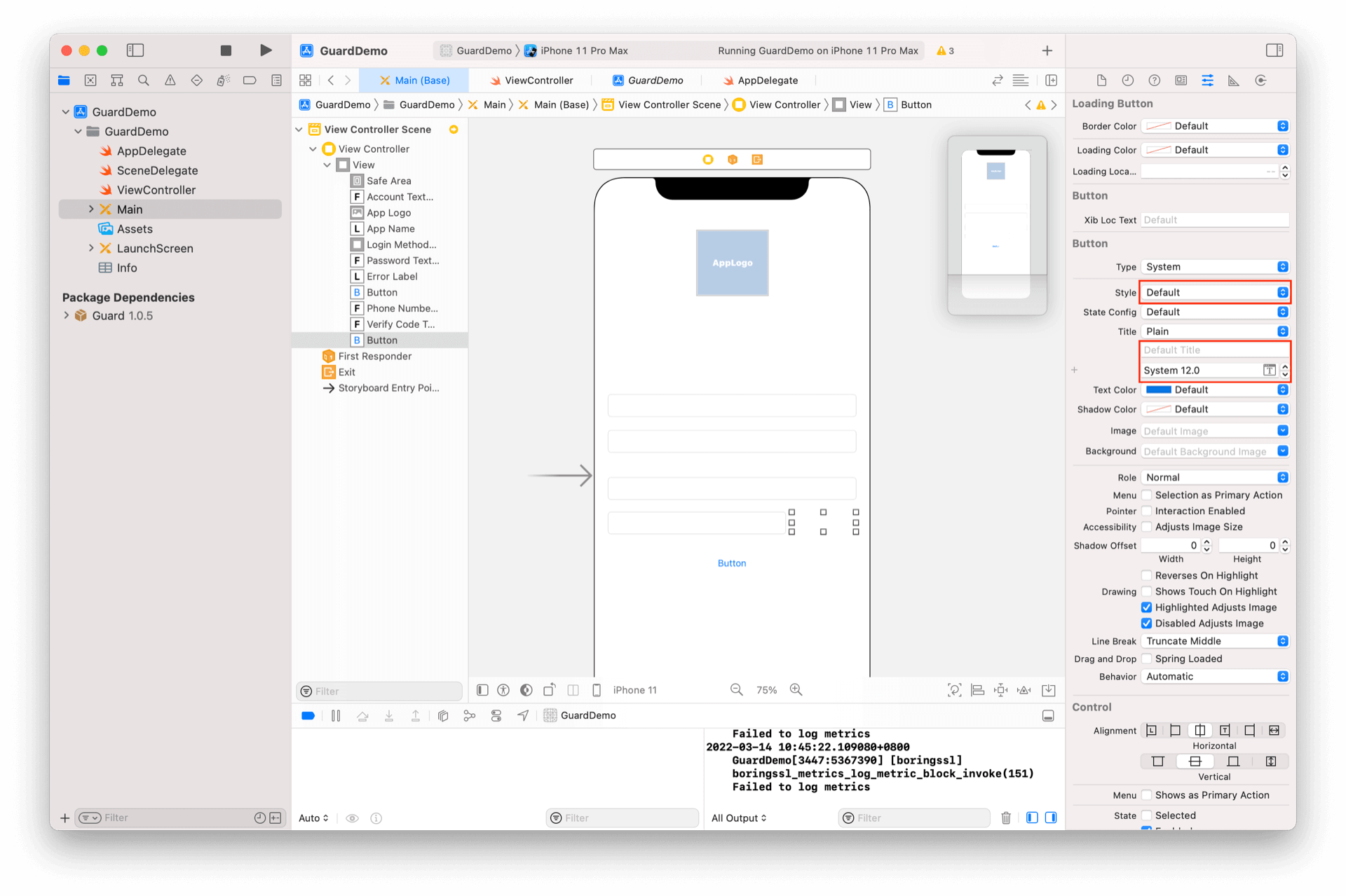 iOS 默认按钮文字较大,我们修改一下 GetVerifyCodeButton 的属性,同时去掉默认的 "Button" 文字