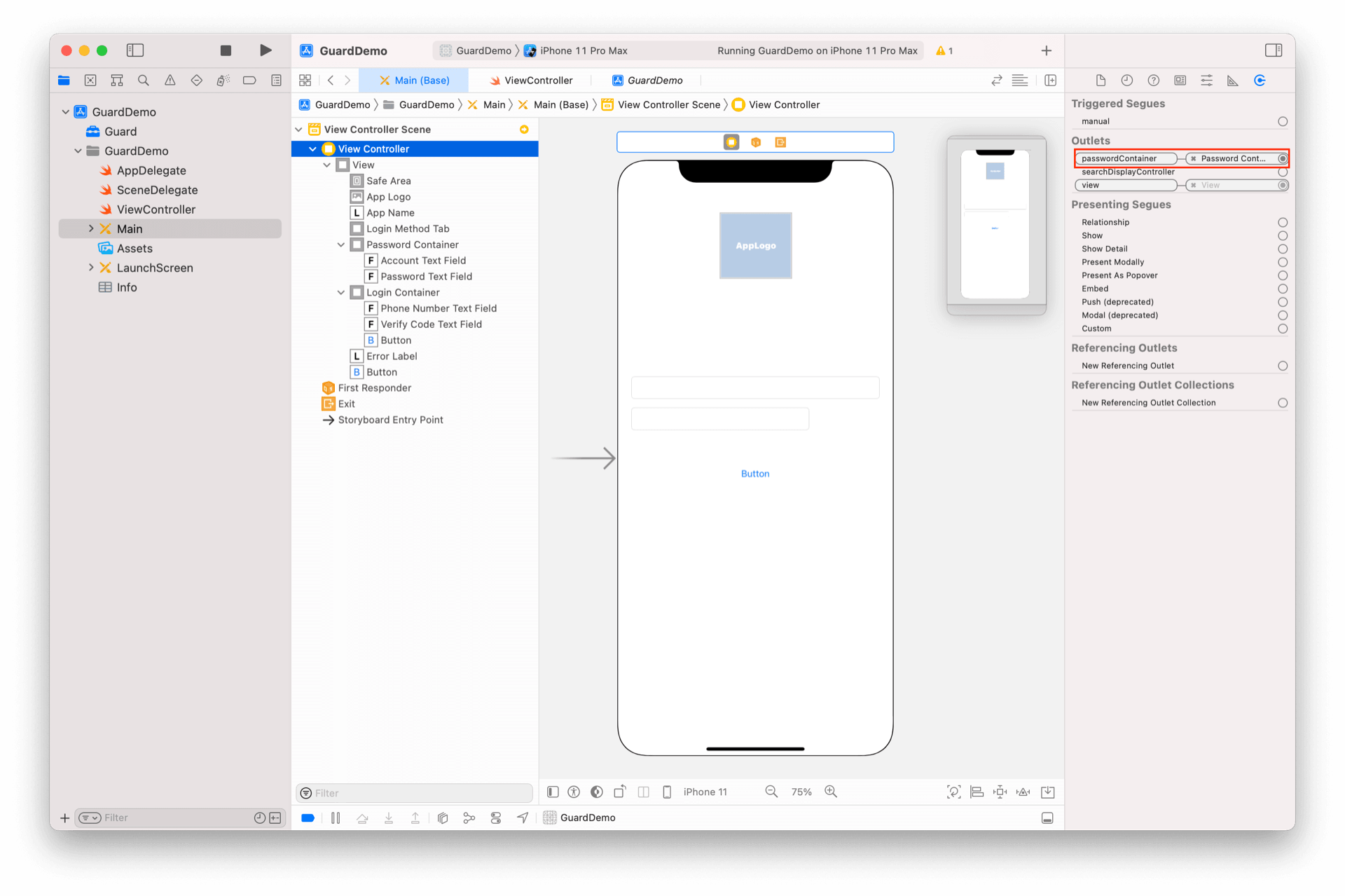 这时如果运行应用程序,会发现“密码登录”容器里面为空。因为 LoginContainer 默认类型为 0,表示通过手机号码+验证码登录,因此,我们需要将帐号密码登录的 LoginContainer 的类型改为 1。首先在 ViewController 里面声明一个 @IBOutlet 成员变量