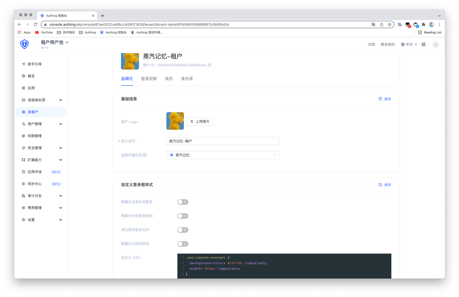 Authing 提供了非常灵活的的登录页面个性化配置,你可以在租户的 品牌化 中进行配置。