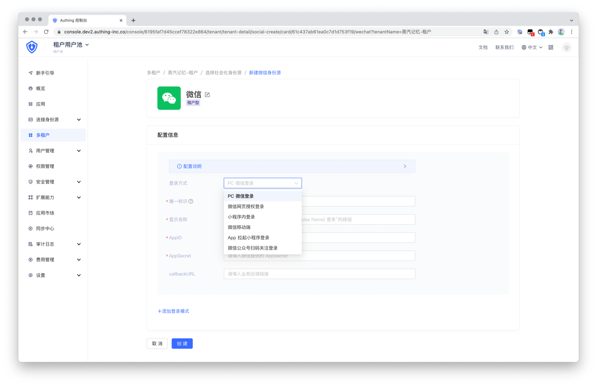 根据不同登录方式的配置要求,填写相关配置信息。点击创建按钮,即可创建新的社会化身份源登录方式。