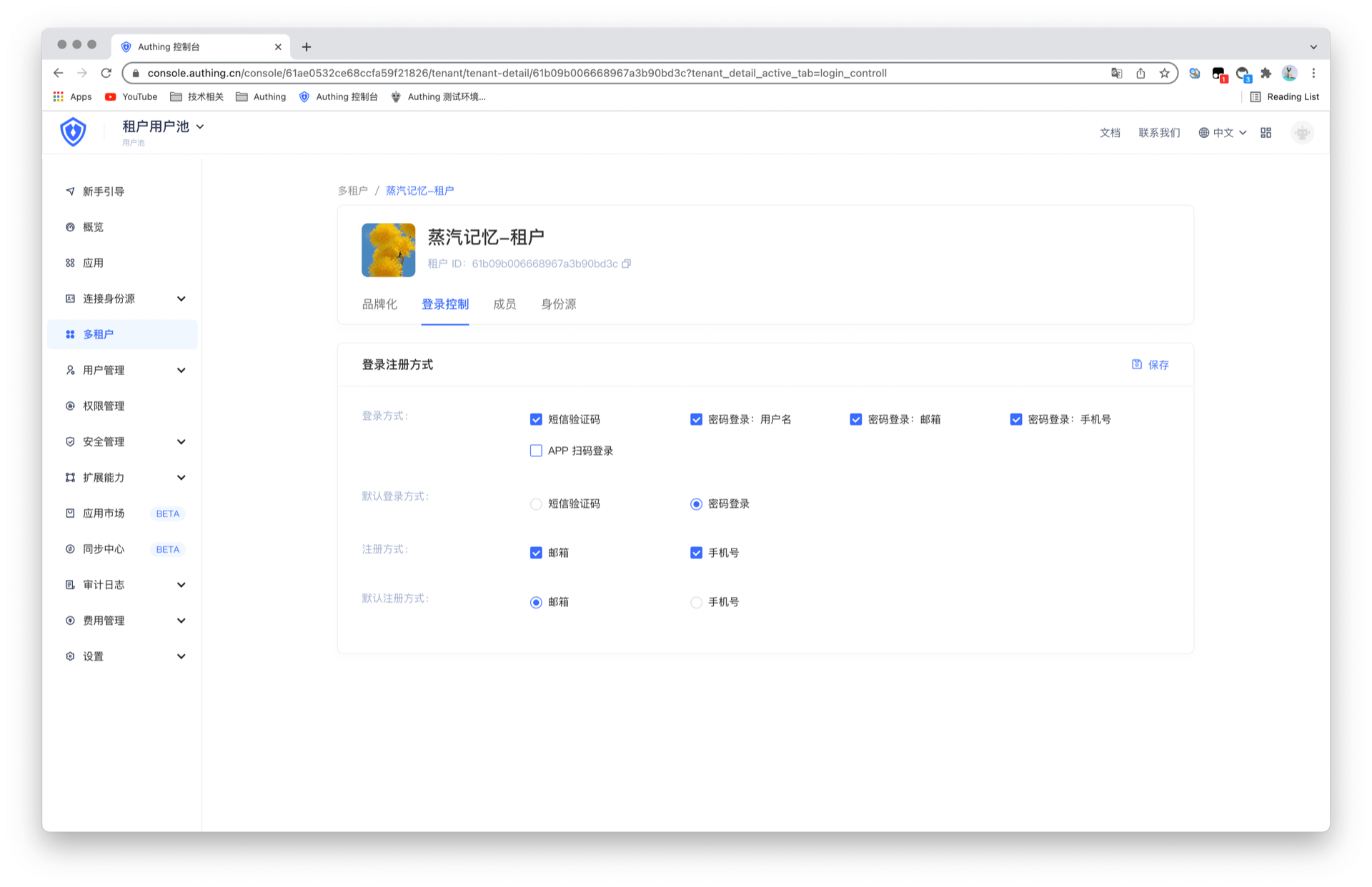 在租户管理页面中,我们默认提供了灵活的登录注册方式配置,如下图所示: