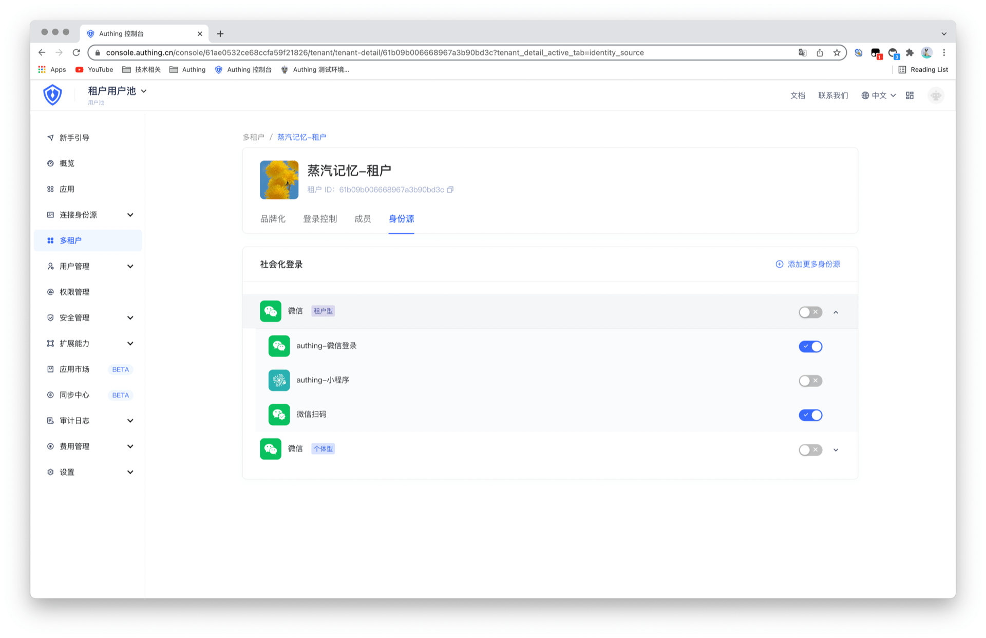 在多租户功能下,Authing 当前也支持接入以下社会化登录方式: