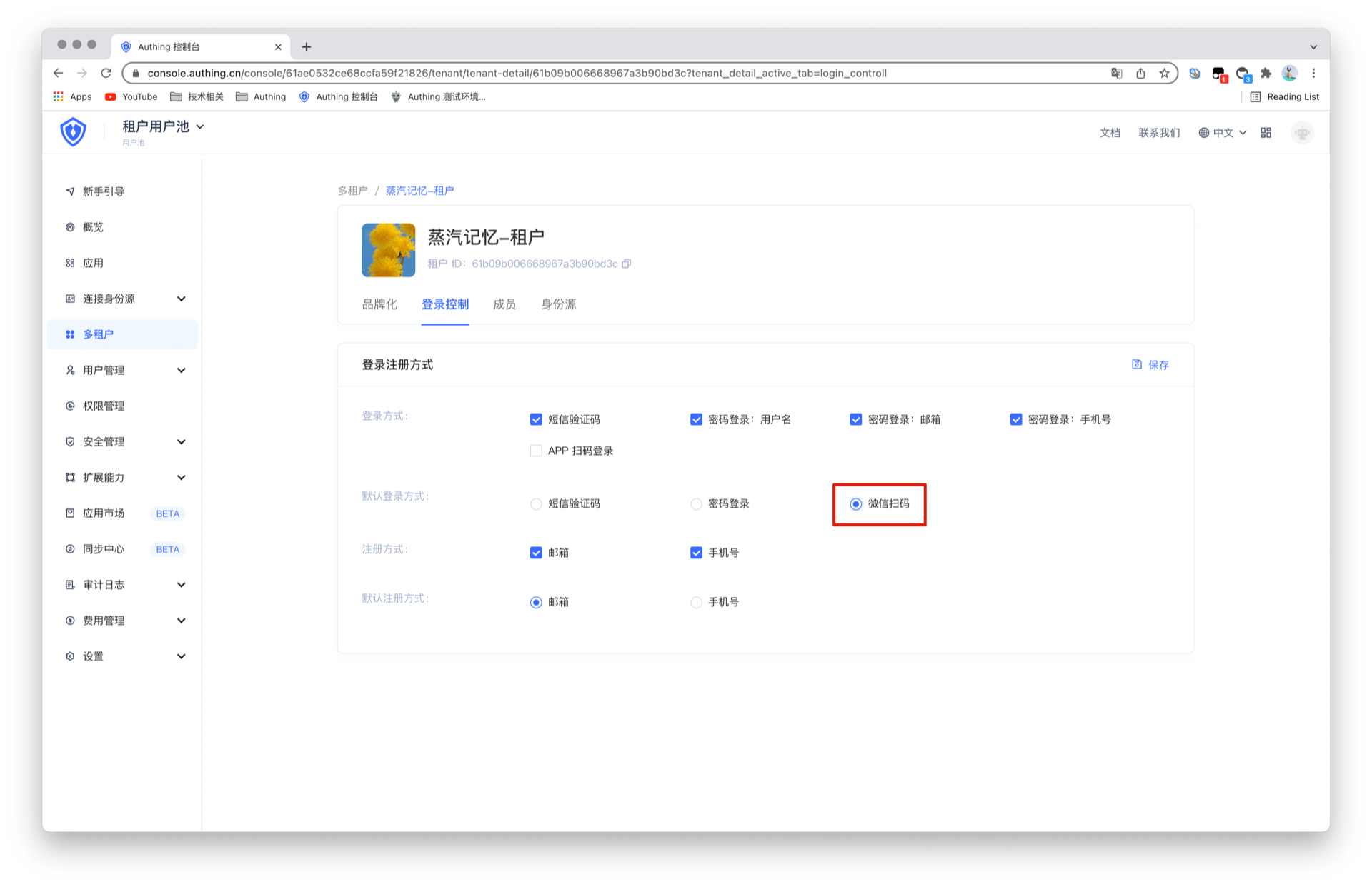 同时,打开租户的登录控制,可以看到默认登录注册方式下会出现了一个「微信扫码」选项,选择并保存即可使用微信扫码作为默认登录方式。